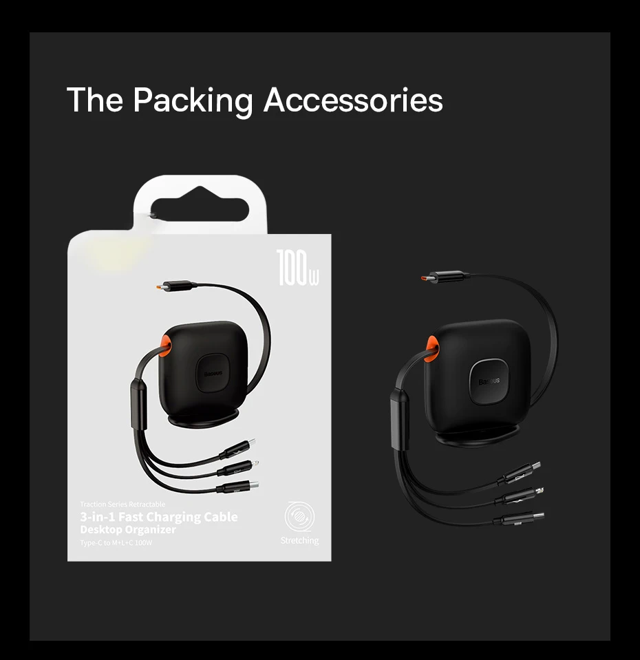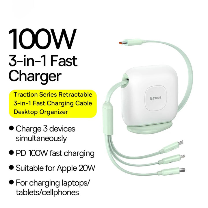 Baseus Câble USB C rétractable 100W 3 en 1 pour iPhone 15 14 13 Chargeur de bureau USB Type C Charge rapide pour Macbook Samsung Xiaomi