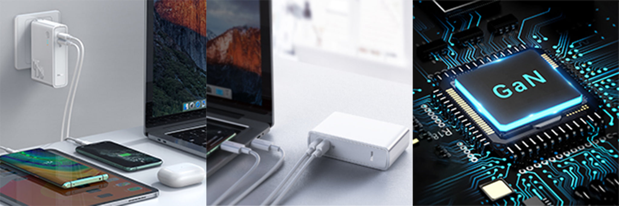 Grâce à la technologie GaN, le chargeur USB C devient plus petit et optimise l'efficacité de charge (jusqu'à trois fois plus rapide) tout en générant moins de chaleur.
